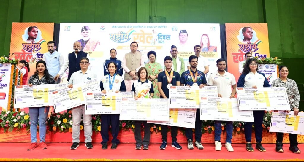 मेजर ध्यानचंद जयंती के अवसर पर बहुउद्देश्यी क्रीड़ा हाल परेड ग्राउंड में आयोजित राष्ट्रीय खेल दिवस – 2025, समारोह को संबोधित करते हुए, मुख्यमंत्री श्री पुष्कर सिंह धामी ने कहा कि खेल और खेल भावना समाज को ऊर्जा, अनुशासन और प्रेरणा प्रदान करती है। उन्होंने कहा कि मेजर ध्यानचंद ने अपनी स्टिक के जादू से पूरी दुनिया को भारत की खेल शक्ति से परिचित कराया। उन्होंने हिटलर तक को ये बता दिया कि देश भक्ति आखिर क्या होती है। उन्हीं के आदर्शों पर चलकर आज प्रधानमंत्री नरेंद्र मोदी के नेतृत्व में हमारा देश भी एक वैश्विक खेल शक्ति बन रहा है, इसमें उत्तराखंड भी अपनी भूमिका निभाने के लिए कमर कस चुका है। उन्होंने कहा कि प्रधानमंत्री “खेलो इंडिया” और “फिट इंडिया मूवमेंट” जैसे कार्यक्रमों के माध्यम से देश में खेल संस्कृति को प्रोत्साहित करने का प्रयास कर रहे हैं। आज हमारे खिलाड़ी केवल किसी प्रतियोगिता में भाग लेने के लिए ही नहीं खेलते बल्कि जीतने और तिरंगा लहराने के संकल्प के साथ मैदान में उतरते हैं। हाल के वर्षों के उदाहरण देखें तो जहां, 2020 के टोक्यो ओलंपिक में भाला फेंक में नीरज चोपड़ा ने स्वर्ण पदक जीतकर इतिहास रचा वहीं पुरुष हॉकी टीम ने 41 वर्षों बाद कांस्य पदक हासिल किया। इसी तरह पेरिस ओलंपिक में नीरज चोपड़ा ने रजत पदक, मनु भाकर ने दो कांस्य पदक, स्वप्निल कुसले व अमन सेहरावत ने एक- एक कांस्य पदक जीतकर और पुरुष हॉकी टीम ने लगातार अपना दूसरा कांस्य पदक जीतकर भारत का गौरव बढ़ाया। हाल ही में हुई एशियाई एथलेटिक्स चैम्पियनशिप में ज्योति याराज्जी, गुलवीर सिंह और अविनाश सबले ने स्वर्ण पदक जीतकर भारत का परचम बुलंद किया है। प्रधानमंत्री नरेंद्र मोदी ने खेल बजट तीन गुना बढ़ा दिया है।