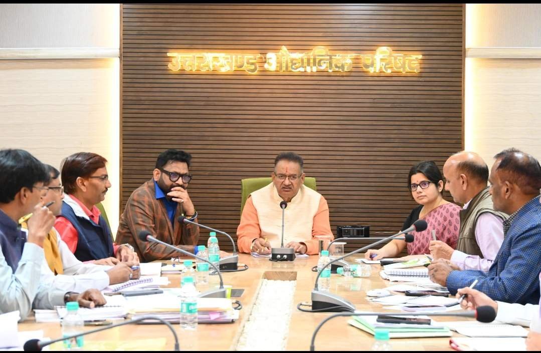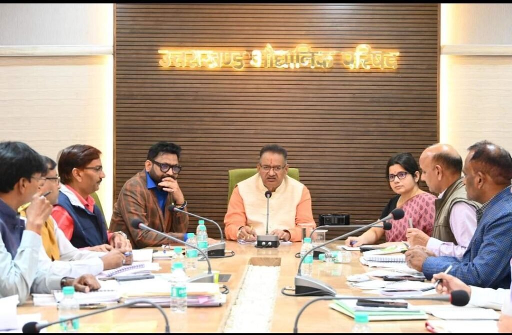 औद्यानिक परिषद सभागार में विभागीय अधिकारियों के साथ कृषि एवं उद्यान विभाग के लंबित प्रकरणों के निराकरण के संबंध में बैठक करते कृषि मंत्री गणेश जोशी