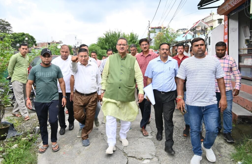 कंडोली में रिस्पना-बिंदाल एलिवेटेड परियोजना के क्षेत्र का निरीक्षण करते कैबिनेट मंत्री गणेश जोशी।