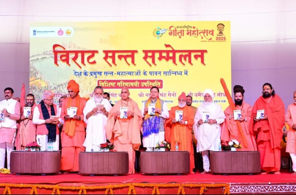 मुख्यमंत्री श्री पुष्कर सिंह धामी ने शनिवार को कुरूक्षेत्र, हरियाणा में अन्तर्राष्ट्रीय गीता महोत्सव में प्रतिभाग किया। इस अवसर पर अपने संबोधन में मुख्यमंत्री ने कहा कि धर्म क्षेत्र कुरुक्षेत्र की पवित्र भूमि पर भगवान श्रीकृष्ण ने अर्जुन को जो दिव्य उपदेश प्रदान किया, वही श्रीमद्भगवद्गीता के रूप में मानवता का शाश्वत ज्ञान बनकर पूरे विश्व को दिशा दिखा रहा है। इस भूमि से धर्म, कर्तव्य, सत्य, निष्काम कर्म और आत्मोन्नति का संदेश सम्पूर्ण मानव समाज में प्रवाहित हुआ। इस भव्य महोत्सव के माध्यम से गीता के संदेश को जन-जन तक पहुँचाने के लिए उन्होंने हरियाणा सरकार एवं स्वामी ज्ञानानंद जी महाराज के प्रति अपनी कृतज्ञता प्रकट की।