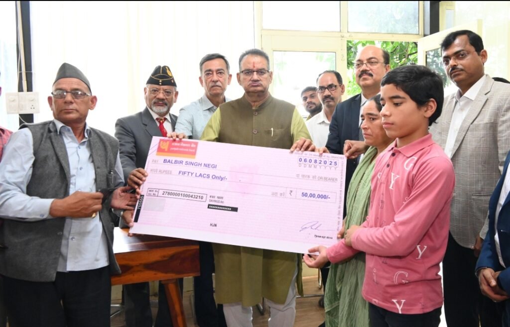 बुधवार को सैनिक कल्याण मंत्री गणेश जोशी ने देहरादून स्थित कैम्प कार्यालय में उपनल के माध्यम से विद्युत विभाग के कार्य करने वाले उपनल कर्मचारी धनवीर सिंह नेगी की आकस्मात मृत्यु होने पर उपनल और पंजाब नेशनल बैंक के बीच हुए करार के क्रम में 50 लाख की धनराशि का चैक मृतक के पिता बलवीर सिंह नेगी तथा उनकी पत्नी मंगीता नेगी का सौंपा। इस दौरान काबीना मंत्री सहित कार्यक्रम में उपस्थित सभी लोगों ने धराली में आयी प्राकृतिक आपदा के दिवंगतजनों को दो मिनट का मौन रखकर श्रद्धांजलि दी और घायल व्यक्तियों के शीघ्र स्वास्थ्य लाभ की कामना की।